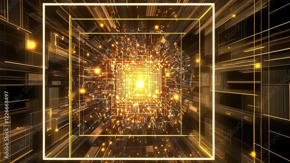 Wall mural glowing orange squares create a mesmerizing tunnel effect, moving dynamically through digital cybers