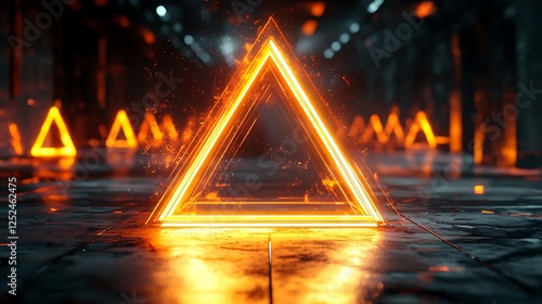 The watermark will not be included on Wall mural.: Glowing orange triangle in dark hall with blurry shapes in the background for graphic use -