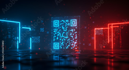 The watermark will not be included on Wall mural.: Glowing qr codes in a futuristic setting with neon lights and reflective surface creating a modern l