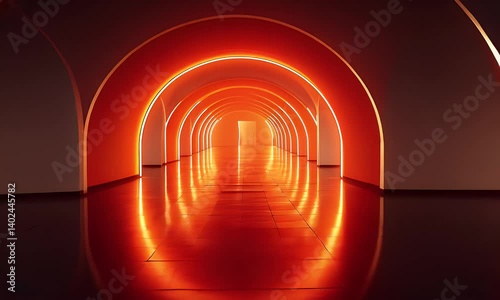 The watermark will not be included on Wall mural.: Glowing red arched corridor with soft illumination and reflective surface creating an abstract atmos