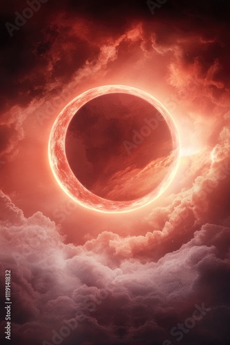The watermark will not be included on Wall mural.: Glowing red moon in the sky with clouds in red color hue