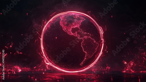 Wall mural glowing red neon planet with rings in dark space generative ai