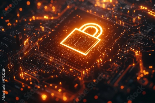 Wall mural : Glowing red padlock embedded in circuitry symbolizing data protection and encryption in a modern hig