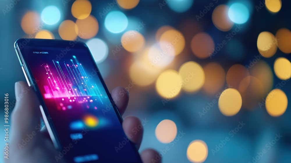 Wall mural : Glowing smartphone display with colorful bokeh lights showcasing modern technology and digital conne