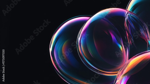 The watermark will not be included on Wall mural.: Glowing soap bubbles isolated on black background - abstract soapy random spheres 3d brutalism design