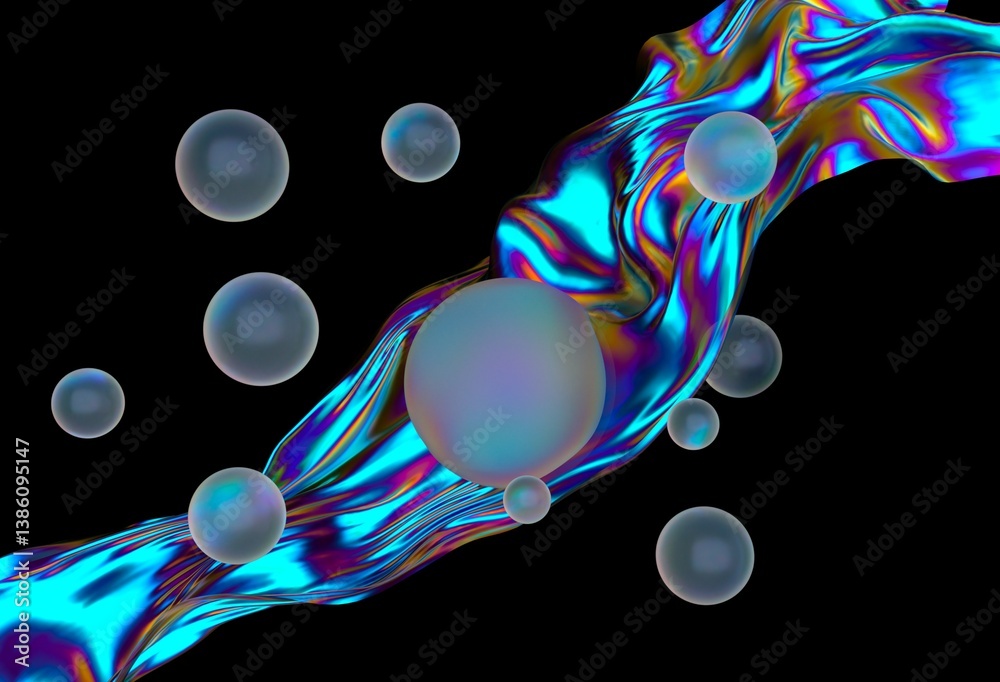 The watermark will not be included on Wall mural.: Glowing spheres float around a vibrant, iridescent wave against a black background, creating a dynam