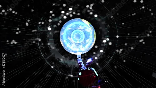 Wall mural glowing spinning earth globe on robot finger with stars on background and hud interface ai style cir