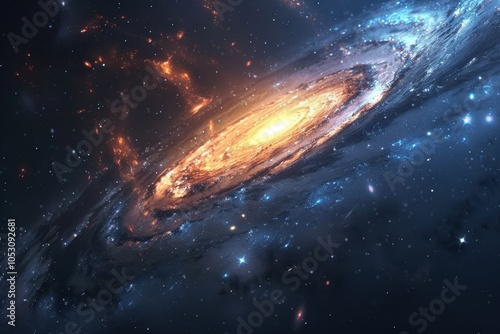 Wall mural : Glowing spiral galaxy with bright center and long, trailing arms in deep space -