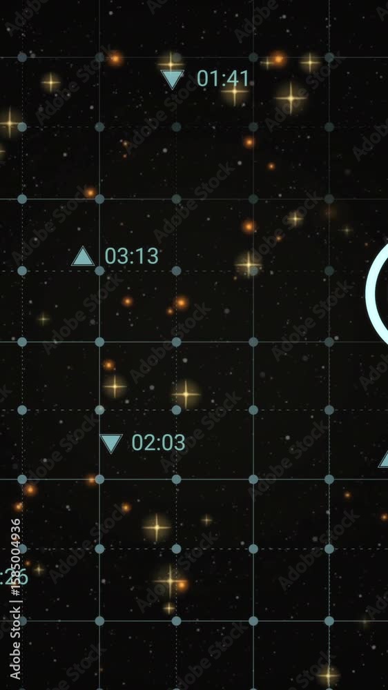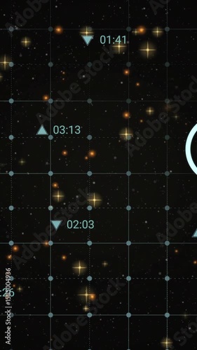 Wall mural : Glowing stars and icons in grid with time codes in space-themed animation