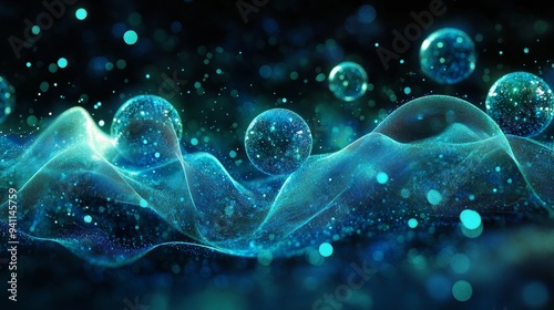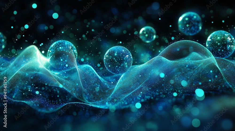 The watermark will not be included on Wall mural.: Glowing teal spheres floating in dark space with ethereal light trails