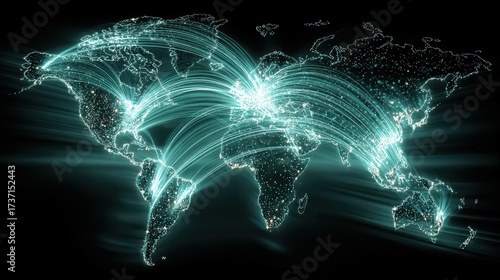 The watermark will not be included on Wall mural.: Glowing world map with interconnected data points and flow lines