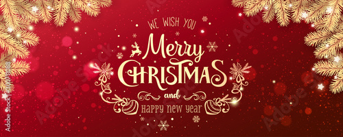 Wall mural gold christmas and new year typographical on red xmas background with winter landscape with snowflak