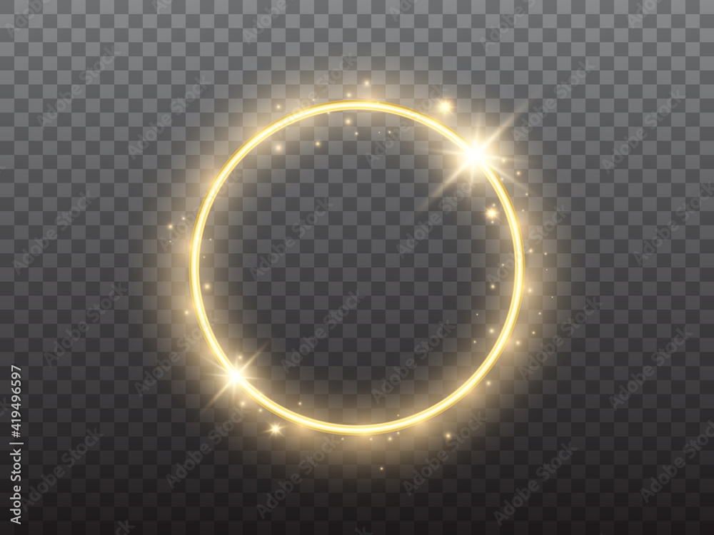 Wall mural gold circle on transparent backdrop. glowing ring with yellow backlight. round golden frame with bri
