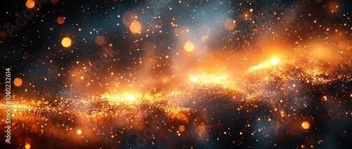 The watermark will not be included on Wall mural.: Golden cosmic dust and sparkles floating through a dark blue and black space background generative a