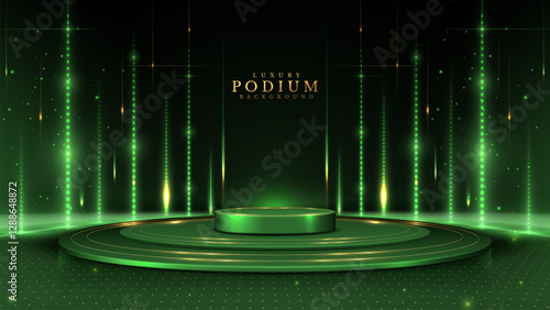 The watermark will not be included on Wall mural.: Golden empty podium on green background with glowing effect decoration and stars, elegant set design