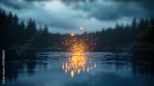 The watermark will not be included on Wall mural.: Golden fireworks reflected on the surface of a lake, creating a symmetrical and mesmerizing visual -