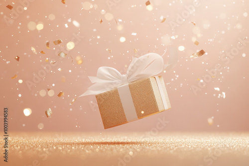 The watermark will not be included on Wall mural.: Golden gift box with a white ribbon is floating on a sparkling background with falling confetti