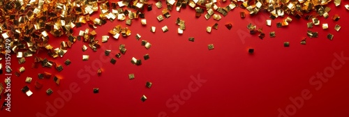 Wall mural : Golden glitter and confetti scattered on a soft red background creating a festive and luxurious effe