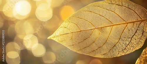 Wall mural : Golden leaf with intricate details against a shimmering bokeh background with copy space for text pl