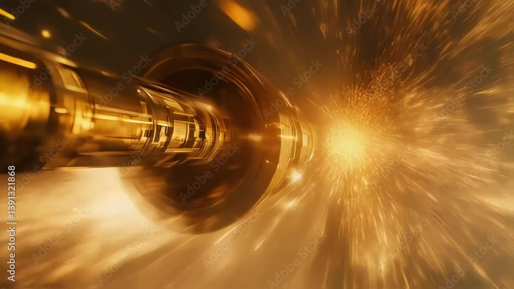Wall mural : Golden light radiating from spacetime portal, luminous particles exploding as spacecraft traveling a