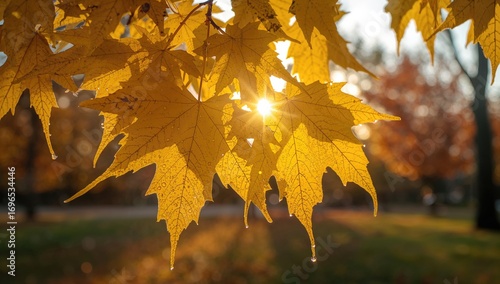 The watermark will not be included on Wall mural.: Golden maple foliage illuminated by soft autumn sunlight with a blurred park backdrop -