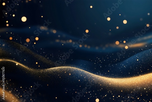 Wall mural golden particle waves floating and flowing over dark blue background, creating luxurious and elegant