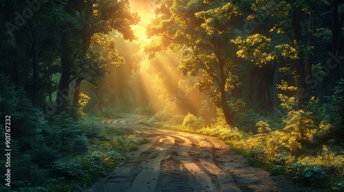 Golden rays illuminate serene forest pathway at dawn in tranquil nature setting - generative aiWall mural