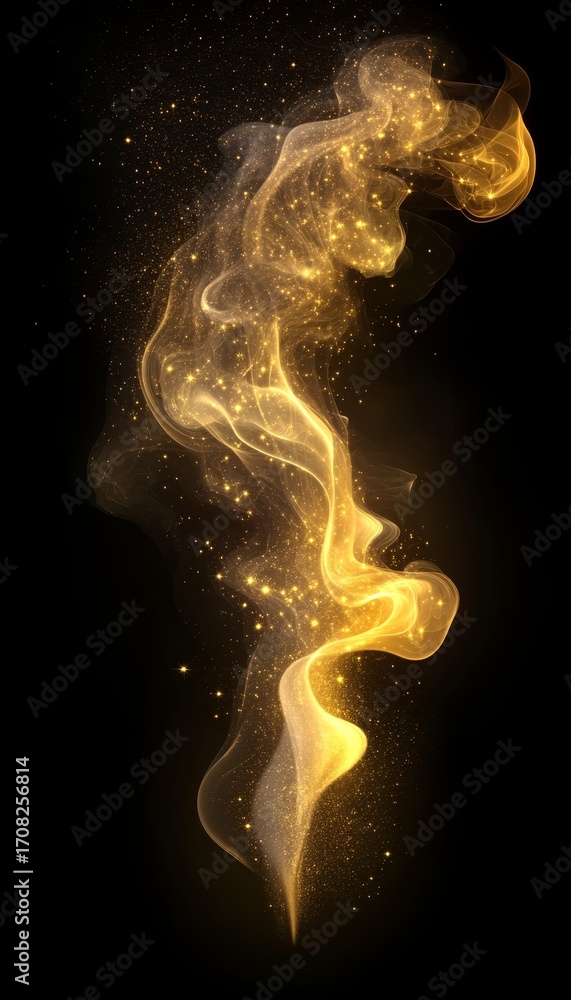 The watermark will not be included on Wall mural.: Golden smokes floating abstractly with dynamic lightning on a pure black backdrop for stunning art