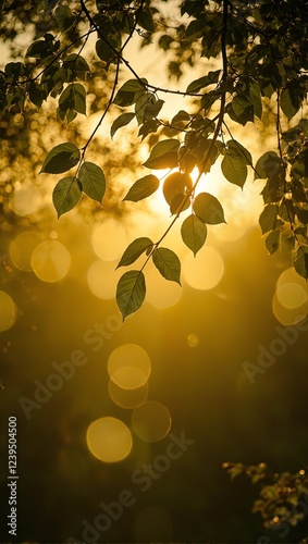The watermark will not be included on Wall mural.: Golden sunlight filtering through tree leaves creating bokeh circles