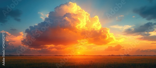 Wall mural golden sunset with vibrant clouds illuminating the sky over a serene landscape, creating a breathtak