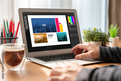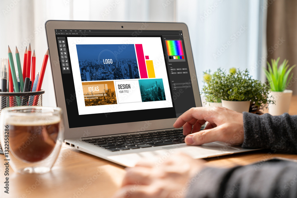Wall mural graphic designer software for modern design of web page and commercial ads showing on the computer s