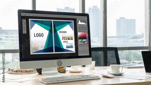 Wall mural graphic designer software for modern design of web page and commercial ads showing on the computer s