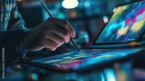 The watermark will not be included on Wall mural.: Graphic designer work on computer laptop and with graphic drawing pen while brainstorming unique des