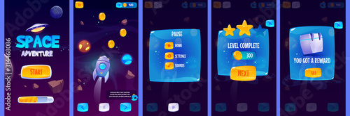 Wall mural graphic user interface for space adventure game. vector set of gui app screens with glossy menu butt