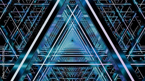 Wall mural graphic with futuristic geometric triangle and line pattern illuminated by neon lights. design