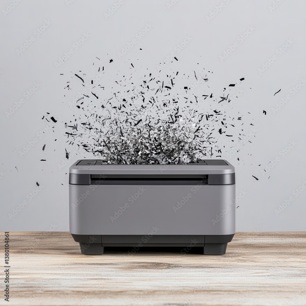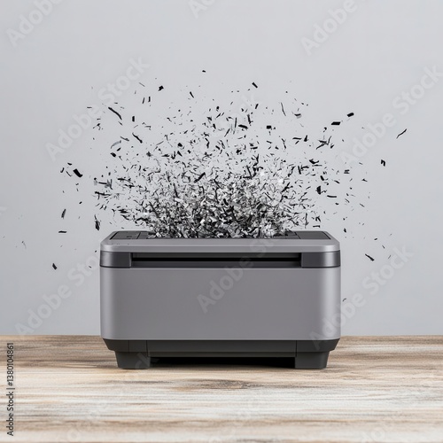 Wall mural gray printer on wooden surface with black particles exploding from it - Wall murals Wall mural gray printer on wooden surface with black particles exploding from it - Wall murals