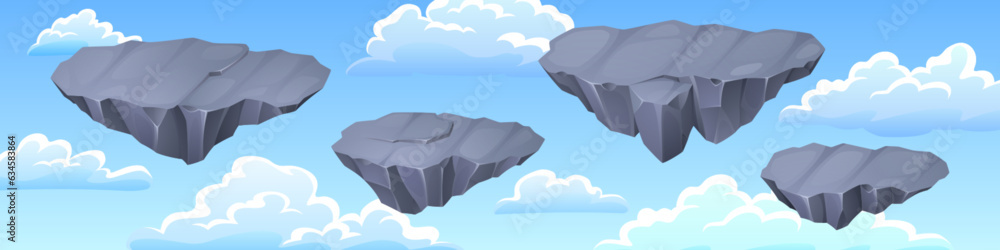 Wall mural gray stone floating islands in blue sky with clouds - game flying rock platforms for level ui design