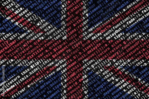 The watermark will not be included on Wall mural.: Great britain flag is depicted on the screen with the program code - the concept of modern technology