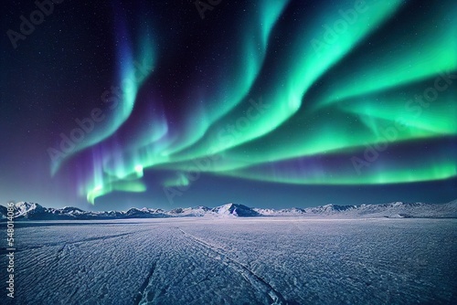 The watermark will not be included on Wall mural.: Green aurora borealis, polar lights over ice and snow landscape, generative ai