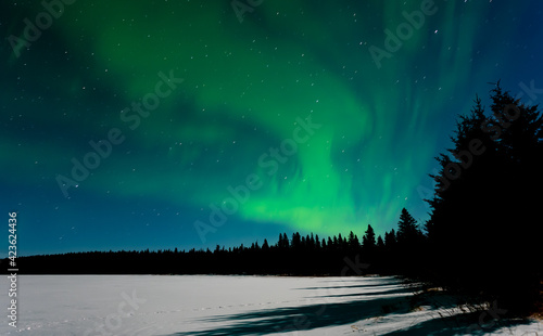 Wall mural : Green aurora swirl above a pine and spruce forest - moon shadows of the trees can be seen on the snow