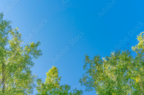 Green crown trees view from below into the sky - green crown of trees against the sky - view of the skWall mural