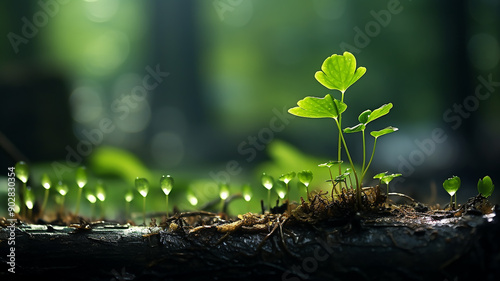 Wall mural : Green forest, dew drops and wet rain on young leaves and shoots in the depths of the green forest of
