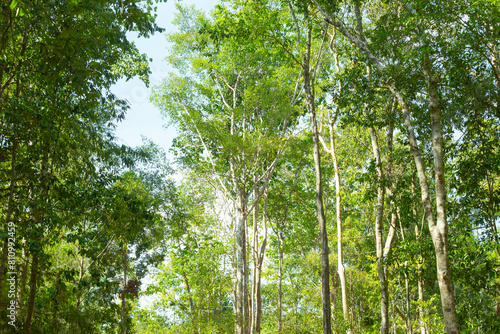 The watermark will not be included on Wall mural.: Green forest background texture with branch of tree in sunny light - sunlight in forest - canopy of ta