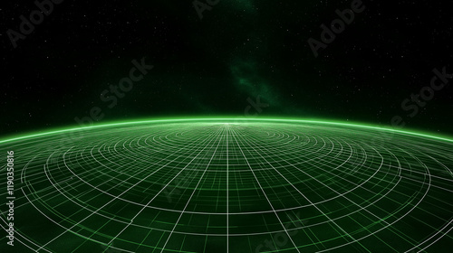 Wall mural : Green grid universe: an abstract digital art depicting a futuristic, grid-like planet against a deep