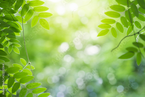 Wall mural green leaf for nature on blurred background with beautiful bokeh and copy space for text.