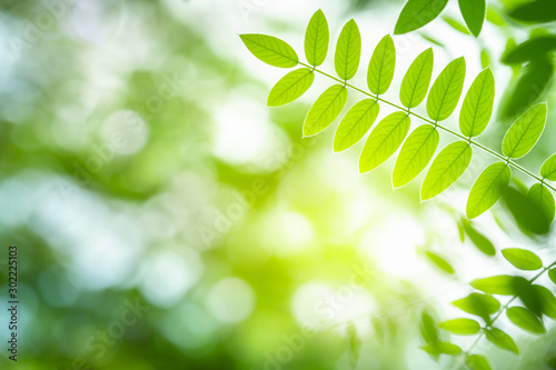 Wall mural green leaf for nature on blurred background with beautiful bokeh and copy space for text.