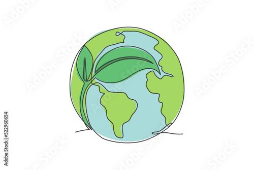 Wall mural green leaf on globe. single continuous line world natural global map graphic icon. simple one line d