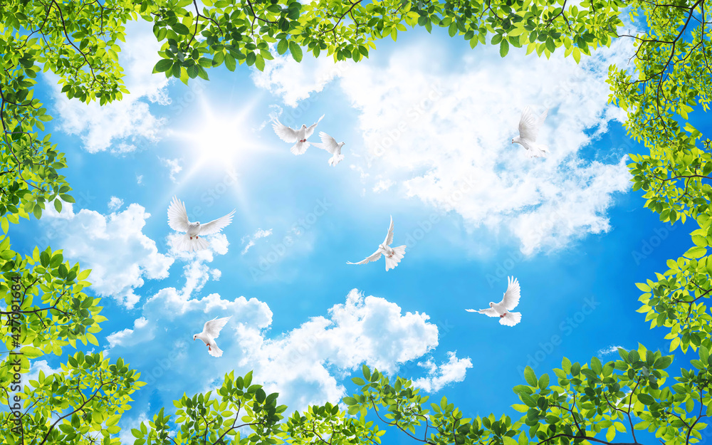 Wall mural green leaves and doves in the sky - Wall murals Wall mural green leaves and doves in the sky - Wall murals