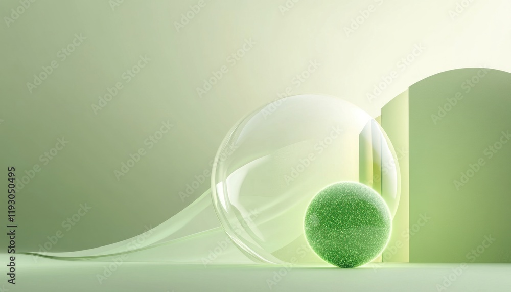 The watermark will not be included on Wall mural.: Green textured sphere and transparent glass sphere creating an abstract scene with flowing fabric