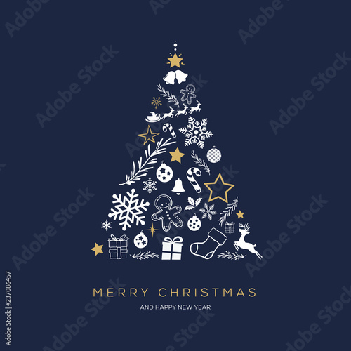 Wall mural greeting card concept with the words merry christmas. abstract christmas tree shape arranged with fe